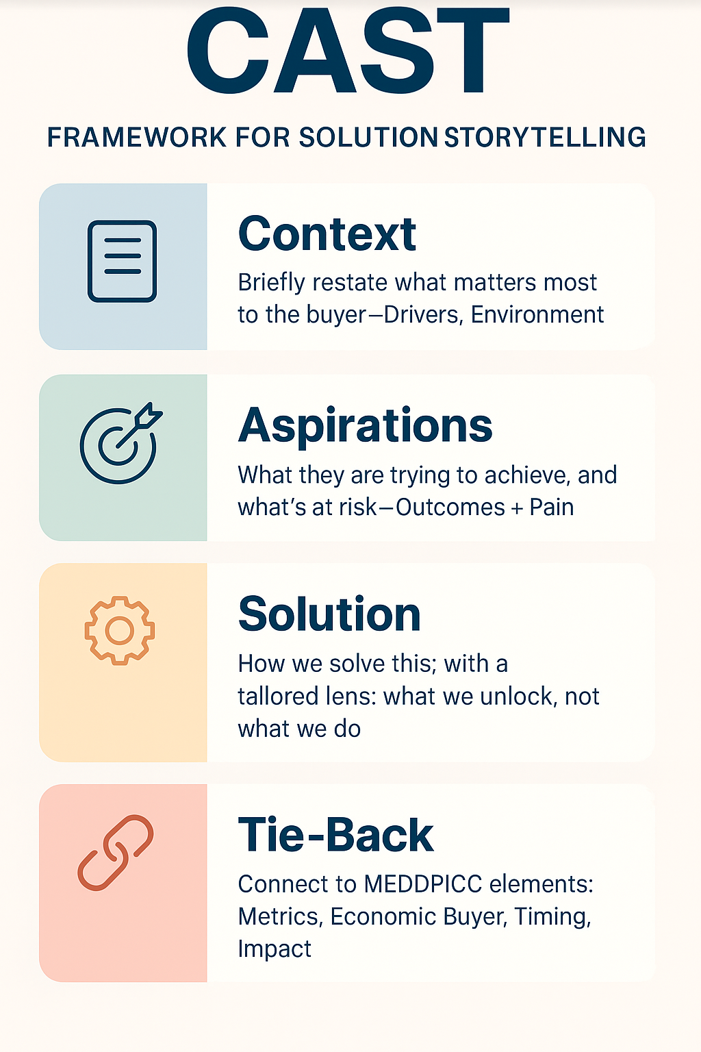CAST is a storytelling framework designed to help sellers communicate a tailored, insight-led solution that ties directly to the prospect’s business context and MEDDPICC. It moves sellers from pitching features to narrating a buyer-centric journey.